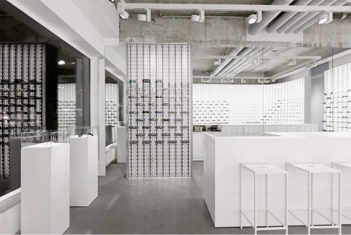 Die Shopfront wurde in ihrer Ursprünglichkeit belassen und nur durch das MYKITA-typische Neonlogo ergänzt. Das warme Holz steht in spannendem Kontrast zur sonst sehr kühlen und nüchternen Innenraumgestaltung des Brillengeschäfts.