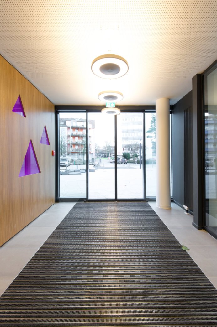 Der individuelle Entwurf der Empfangsmöbel des Neubaus nimmt die Formensprache der Architektur von PK+ harmonisch auf. Die Tresen mit ihren sanften Rundungen führen die Besucher und laden sie ein. Die Farbgebung der Einbauten folgt der CI des BWV. Das Pink des Logos findet sich in Akzenten im gesamten Innenraum wieder.